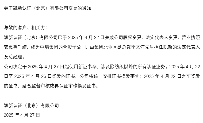 2025.09.05綠色賦能,智鏈全球——凱新認證亮相2025 Intertextile秋冬展,共繪紡織可持續(xù)新圖景2025年9月2至4日,中國國際紡織面料及輔料(秋冬)博覽會(以下簡稱:2025 Intertextile秋冬面輔料展)在國家會展中心(上海)成功舉辦。2025.09.02凱新認證紡織認證部赴Cotecna集團北亞區(qū)&中國區(qū)總部參加培訓(xùn),專業(yè)能力再上新臺階近日,我司紡織認證部審核員團隊赴Cotecna集團北亞區(qū)&中國區(qū)總部參加了由資深專家張偉龍主講的培訓(xùn)。此次培訓(xùn)圍繞環(huán)境管理體系等相關(guān)標(biāo)準(zhǔn)、審核要點及行業(yè)實踐展開,通過理論講解、案例分析和互動研討,進一步提升了團隊的專業(yè)技術(shù)能力和服務(wù)水平。2025.07.02凱新認證(北京)有限公司順利通過ANAB FSSC 22000食品安全體系現(xiàn)場見證評審凱新認證(北京)有限公司(以下簡稱“凱新認證”)成功通過美國國家認可委員會(ANAB)對FSSC 22000食品安全管理體系的現(xiàn)場見證評審,并以零不符合的卓越表現(xiàn),彰顯其行業(yè)實力與專業(yè)水準(zhǔn)。2025.04.27關(guān)于凱新認證(北京)有限公司變更的通知尊敬的客戶、相關(guān)方: 凱新認證(北京)有限公司已于2025年4月22日完成公司股權(quán)變更、法定代表人變更、營業(yè)執(zhí)照變更等手續(xù),成為中瑞集團的全資子公司,由集團北亞區(qū)副總裁李文江先生擔(dān)任凱新的法定代表人及總經(jīng)理。
